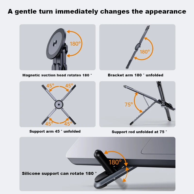 - Its 360-degree rotating design allows you to use your tablets, laptops, or MacBook's at any angle you desire.